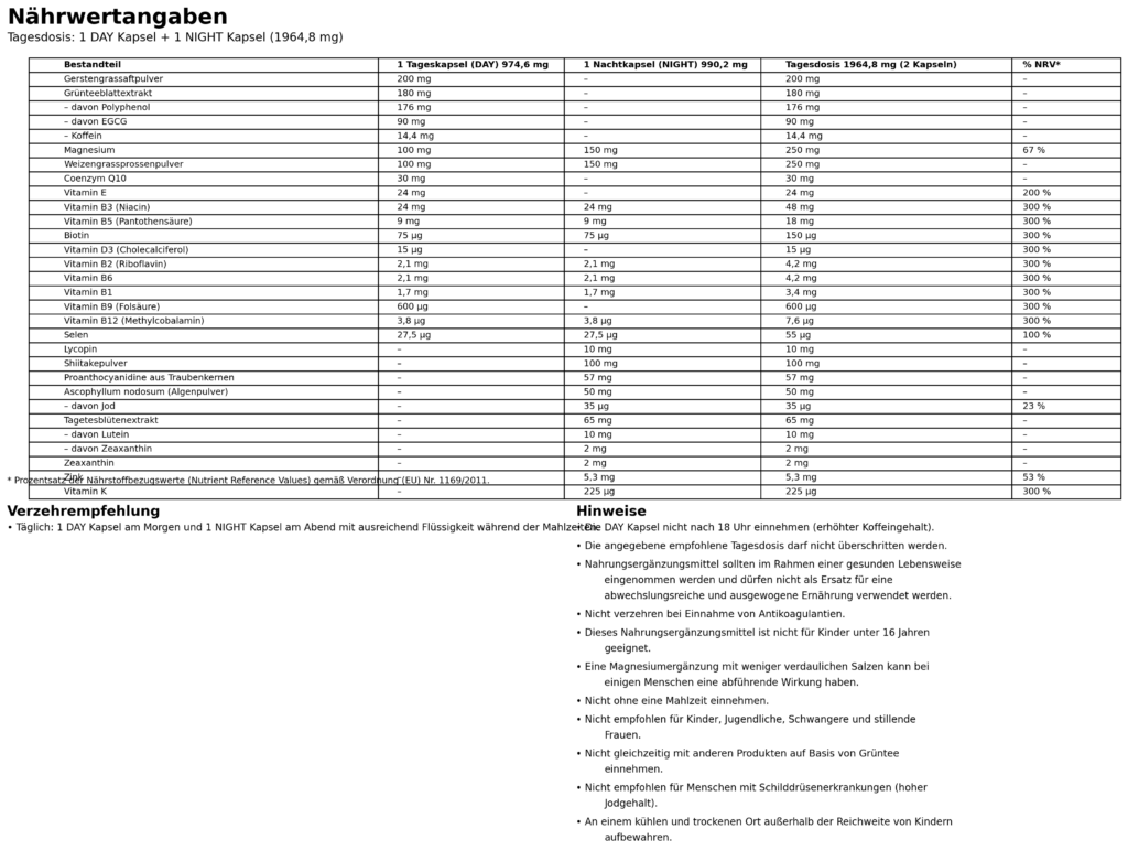 Täglich zwei Kapseln einnehmen – eine Kapsel morgens (DAY-Komplex) und eine Kapsel abends (NIGHT-Komplex). Die empfohlene tägliche Verzehrsmenge darf nicht überschritten werden.